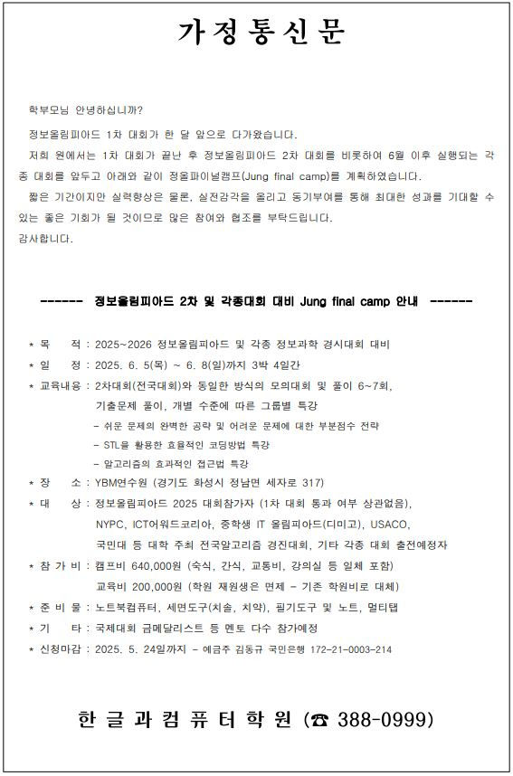 정보올림피아드 2차 및 각종대회 대비 정올 파이널 캠프(Jungol Final Camp)를 안내드립니다.